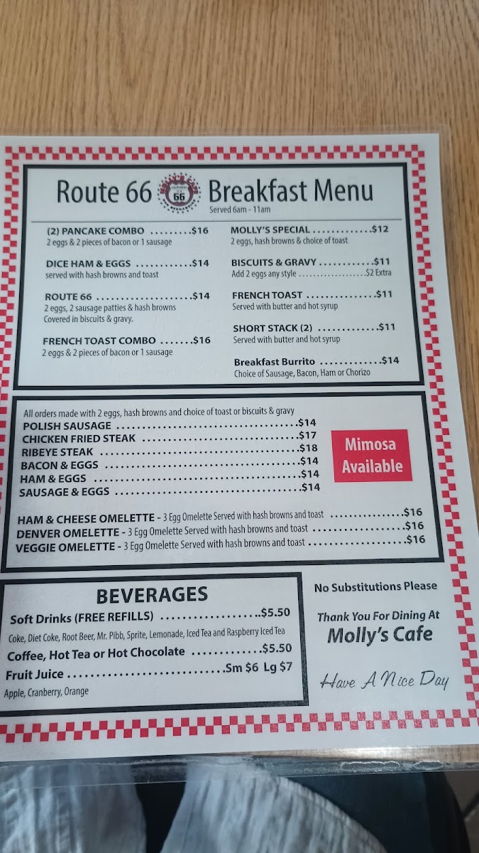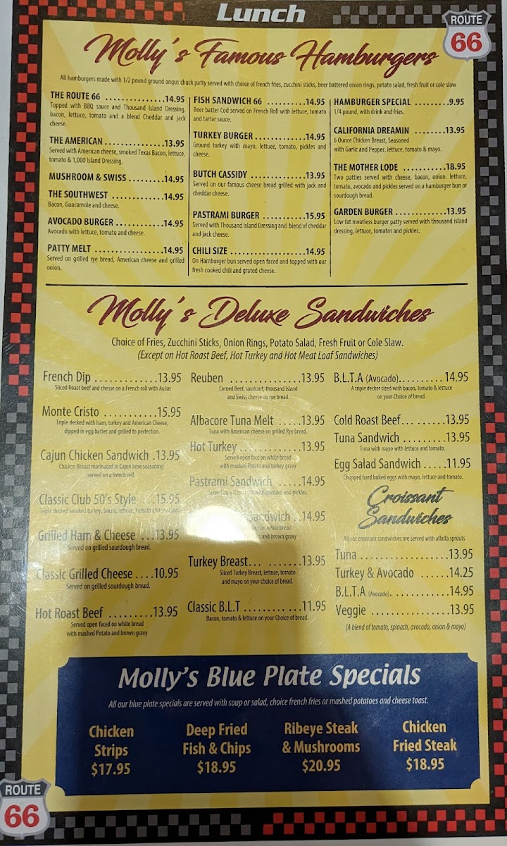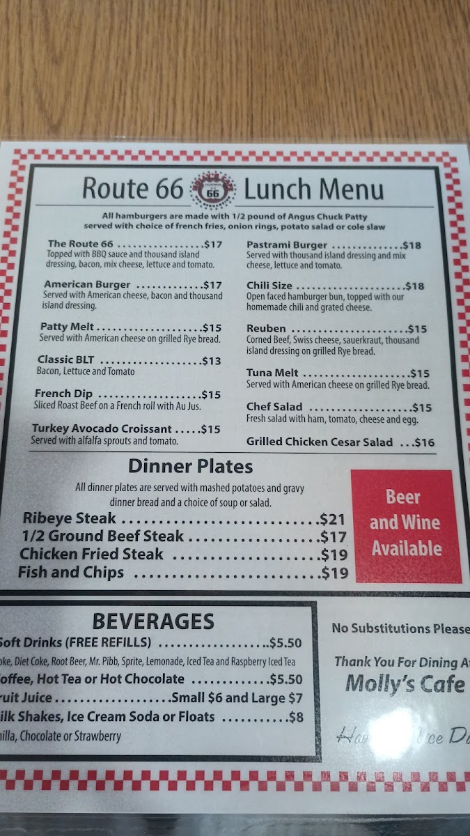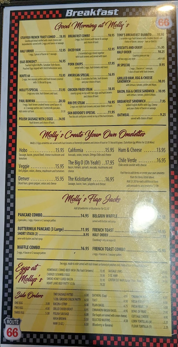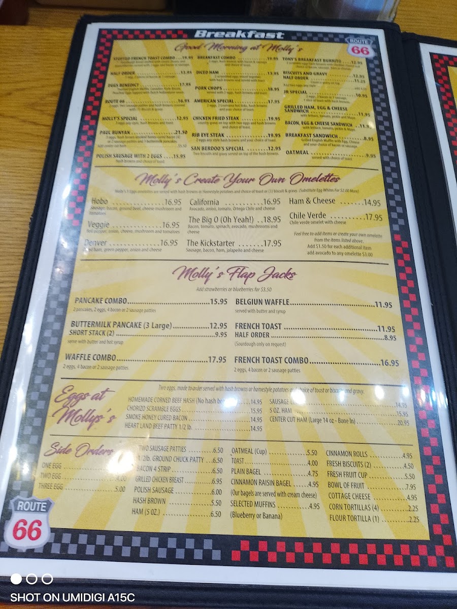 The inviting atmosphere at Molly's Cafe is a major draw. Guests remark on the friendly and attentive service, with many like Shannon Elrod sharing their appreciation for the charming, cozy ambiance, especially during quieter hours. It’s a place where you can relax and savor your meal, whether you're enjoying a quiet breakfast or catching up with friends over lunch. The Route 66 theme contributes to the café's unique charm, reminding diners of the classic American diner experience.